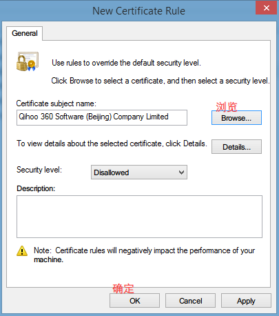 以拉黑 360 的证书为例,点击浏览按钮,然后选择 360 的证书,点击确定之后,你的电脑就无法启动 360 的安装包了。