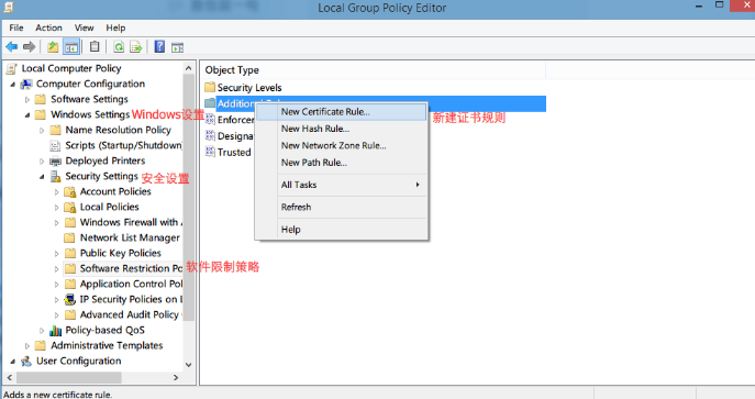 依次按照图片上的中文提示展开,我的是英文系统,大家看到的会是中文界面。右键附加规则,选择新建证书规则。