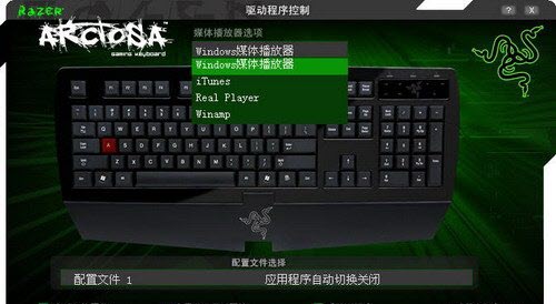 Razer Arctosa三齿熊蛛依然还是Razer的暗绿色风格,驱动软件只有在键盘接通的时候才可以打开。最上方是多媒体播放器选单,有4个播放器可以选择。光标移动到任一按键上后,该键就会变成红色,左键点击一下就会出现编程界面。