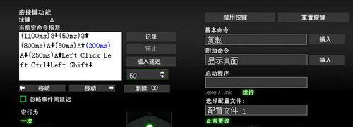 按下“记录”就开始录制宏了,可以记录下任何按键的动作和时间延迟(当然也可以选择不记录延迟),点击“插入延迟”可以在任意位置插入延迟,可以选择以50、100、150、200毫秒为单位叠加。选中某一个动作(变蓝色)后,可以将它移动或者删除,点击鼠标左、中、右键和右侧的复制、显示桌面等也可以插入相应的动作。然后,在左下角还可以选择是单次反应还是会重复。