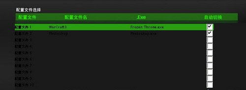 点击键盘照片下面的“配置文件选择”或者主界面左下角的绿色倒三角,就会出现如下的配置文件设置界面,有1-10的编号,在“配置文件名”列双击就能对该配置文件进行命名,同理点击.exe列就能选择相应的应用程序。