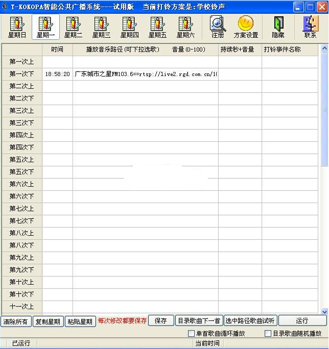 TKOKO自动定时打铃软件是一套小巧免费通用性很强的铃声控制管理系统,提供了完备的铃声时间播放功能。提供多种方案管理,适合不同情况下自由切换。操作简单方便,非专业人士无需培训,一看就会操作。