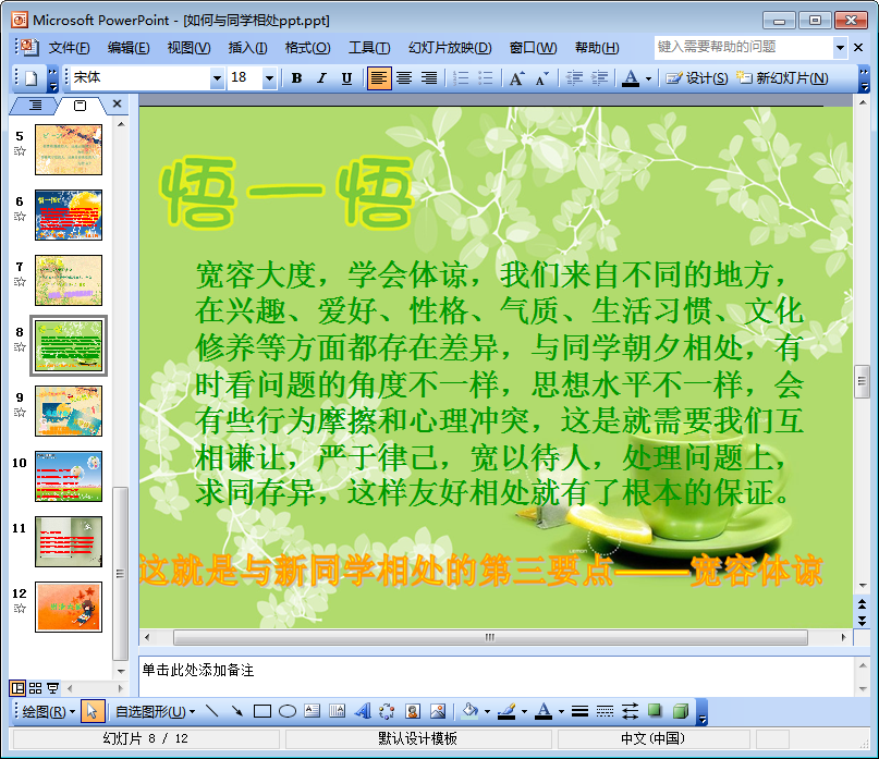 宽容大度,学会体谅,我们来自不同的地方,在兴趣、爱好、性格、气质、生活习惯、文化修养等方面都存在差异,与同学朝夕相处,有时看问题的角度不一样,思想水平不一样,会有些行为摩擦和心理冲突,这是就需要我们互相谦让,严于律己,宽以待人,处理问题上,求同存异,这样友好相处就有了根本的保证。