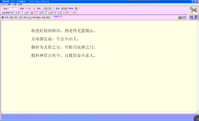 你只需输入你的姓名,准确输入性别、出生年、月、日、时、分(农历-阳历均可),余下的事就由精科神算软件为你来完成了。按推算后,它会自动推算出你的婚姻、财运、子女、事业、性格、寿元、骨重、星座、先天八字、属相、年龄、五行等(注:未满16岁,星座推算将不预测其婚姻、事业、财运,且属相有图像及声音提示)算命所需的一切信息,支持打印,同时内附MID、WAV、MP3背景音乐播放。