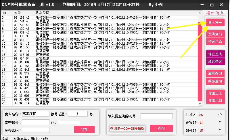 软件查询后可以分别导出正常的和被封的账号,能更简单的管理、操作使用!