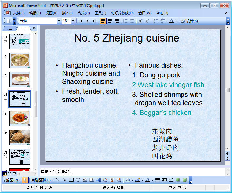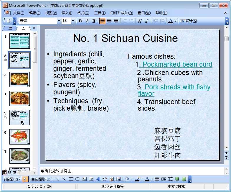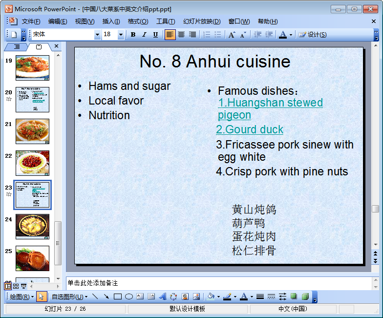 你知道中国的八大菜系是哪些菜系吗?你知道这些传统菜系的代表菜分别是什么吗?你知道这些代表菜应该怎么翻译成英文吗?本节内容东坡小编为大家整理带来的是一份内容完全免费的共由17页组成的中国八大菜系中英文介绍ppt,内容十分详细,图文并茂,欢迎感兴趣的朋友们前来下载!