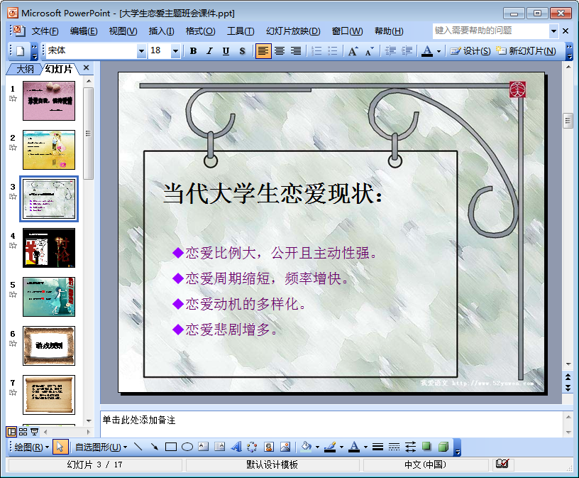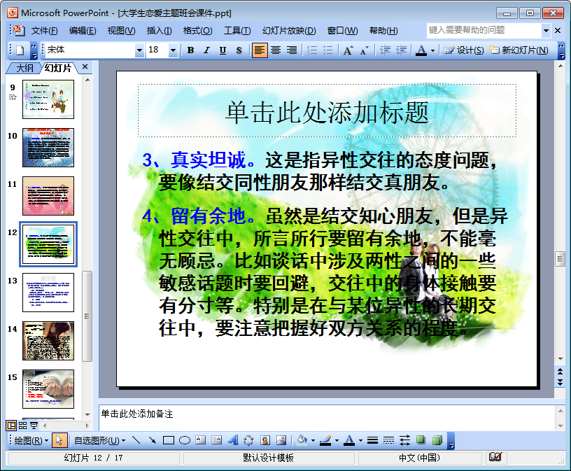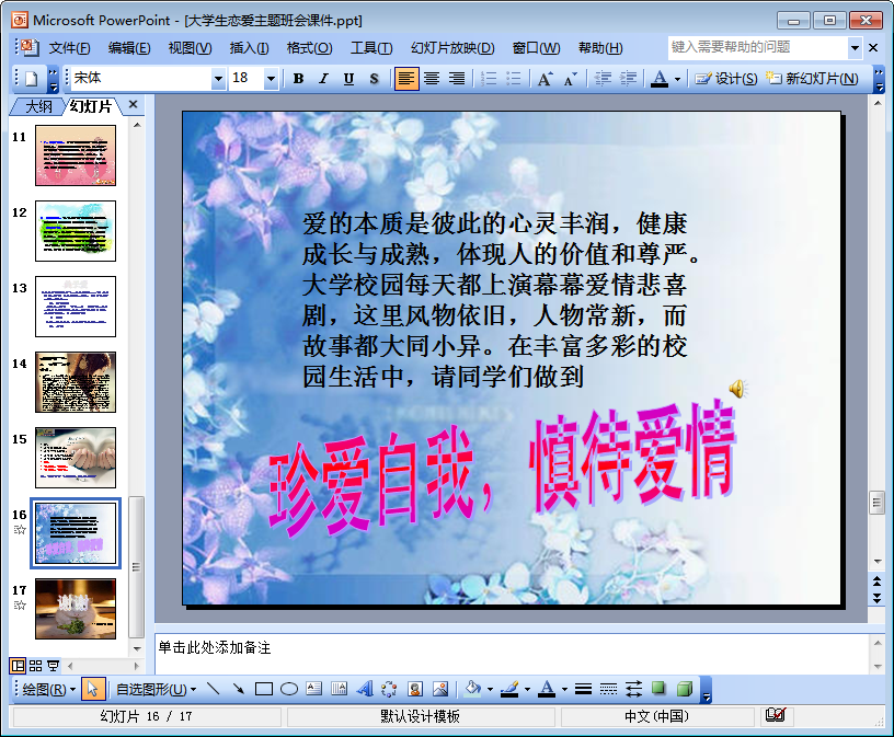 珍爱自我,慎待爱情——这是一份适合作为大学生恋爱主题班会课件进行选取使用的ppt,该ppt共17页,内容包含有当代大学生恋爱现状分析、培养健康恋爱心理行为介绍、如何建立起积极向上、健康发展的异性关系问题探讨等,下文是该ppt的内容摘选及预览图,欢迎有需要的朋友们前来下载!