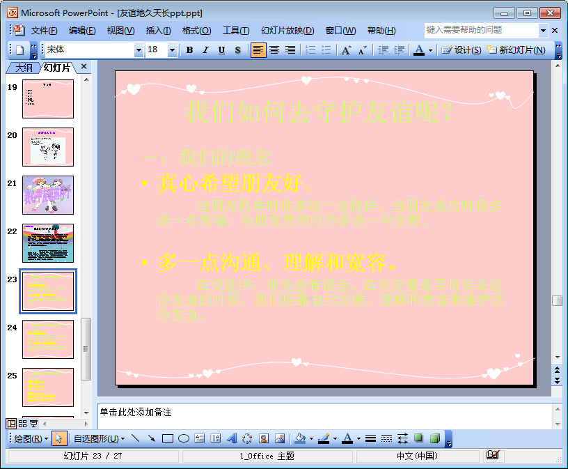 友谊地久天长——这是一份探讨关于什么是友谊?以及我们该如何去守护友谊的ppt,该ppt共27页,适合作为班会课件进行选取使用,如果你需要一份召开一场主题为“友谊”的班会,那么该友谊地久天长ppt将会为你提供不小的帮助哦!欢迎有需要的你前来下载使用!