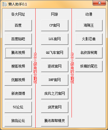 这是一款很小巧的工具,主要是针对一些比较懒散的朋友定制的一款小工具,其实就是一个网址大全。内含各视频网站、游戏官网以及动漫网站,都是挺热门的,分配也合情合理。需要的朋友可以下载试试!