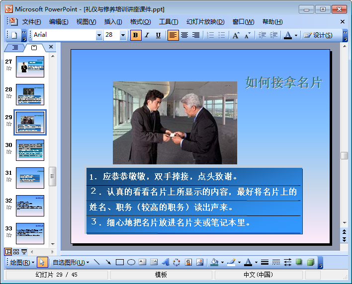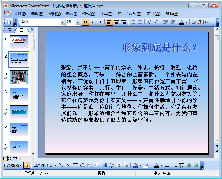 什么是礼仪?修养的含义又是什么呢?本节内容东坡小编为大家整理带来的是一份由45页组成的礼仪与修养培训讲座课件,在这份ppt课件中你不仅会得到前面两个问题的答案,还能增长很多关于礼仪的知识呢!感兴趣的朋友你还在等什么?快来东坡下载吧!