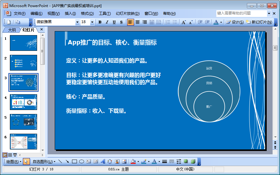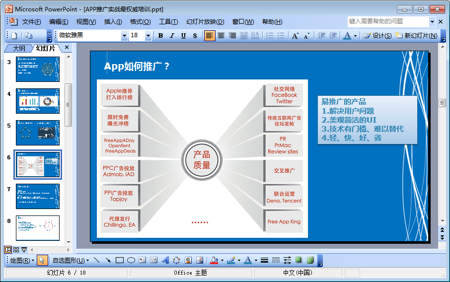 想要从事App推广工作的朋友们必须要弄清楚几个问题——一是什么是App推广?再有就是为什么要推广?产品要怎样推广?当然,还应该参考相关案例。本节内容东坡小编为大家整理带来的正是一份APP推广实战最权威培训课件,方便想要从事App推广工作的朋友们进行查阅使用!该ppt共18页,内容完全免费,有需要的朋友们可以放心下载!