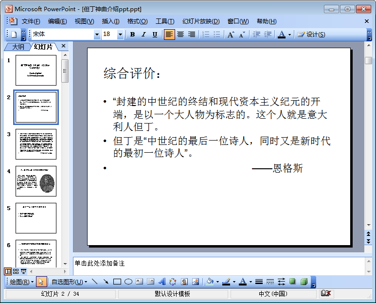 “封建的中世纪的终结和现代资本主义纪元的开端,是以一个大人物为标志的。这个人就是意大利人但丁。