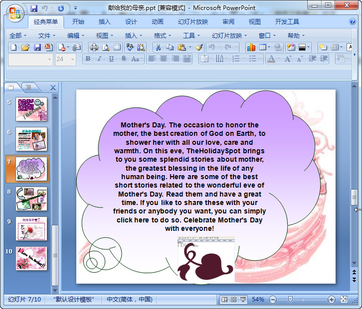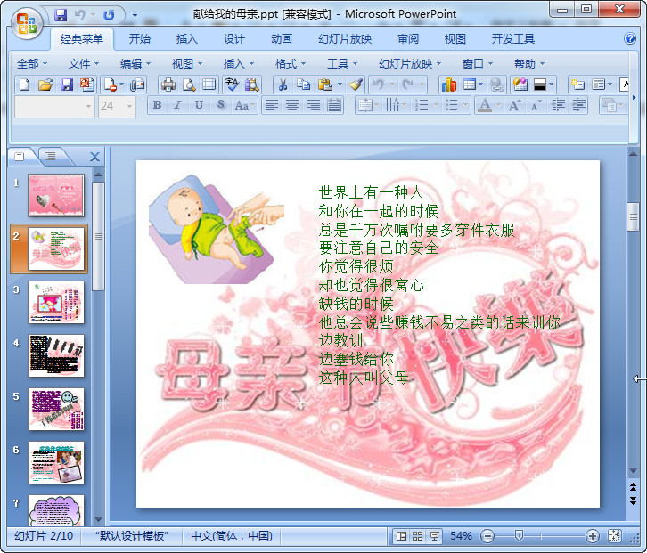 献给我的母亲ppt模板,也可以当做范例哦。可以参加朗诵比赛的时候拿来用,只要换掉其中的一些字样就可以了哦。欢迎有需要的朋友前来东坡下载这份温馨的关于母爱感恩的ppt模板。