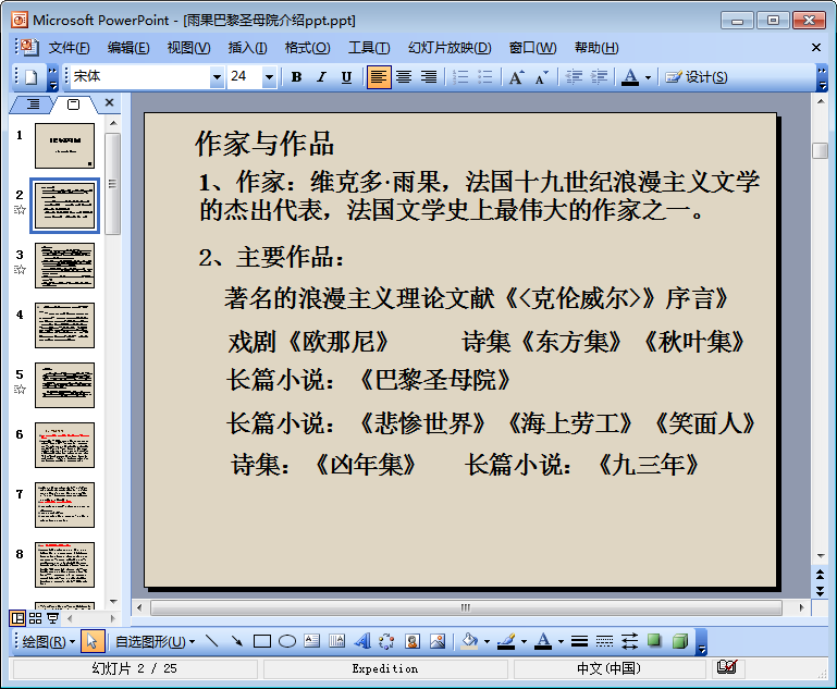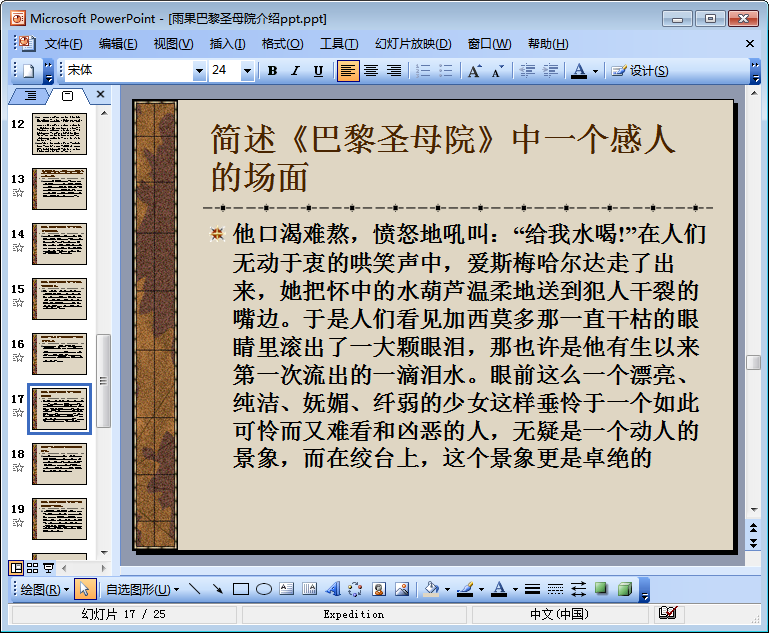 这份由东坡小编为大家最新整理带来的介绍雨果小说巴黎圣母院的ppt共由17页组成,ppt内容包括小说作者介绍以及故事内容介绍等,当然还包含有小说人物形象分析等,是一份不可多得的介绍巴黎圣母院的ppt,欢迎有需要的朋友们前来下载查阅!