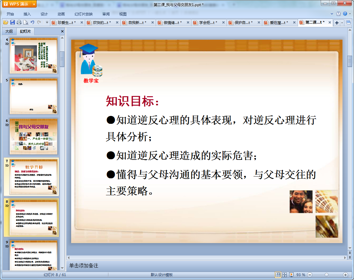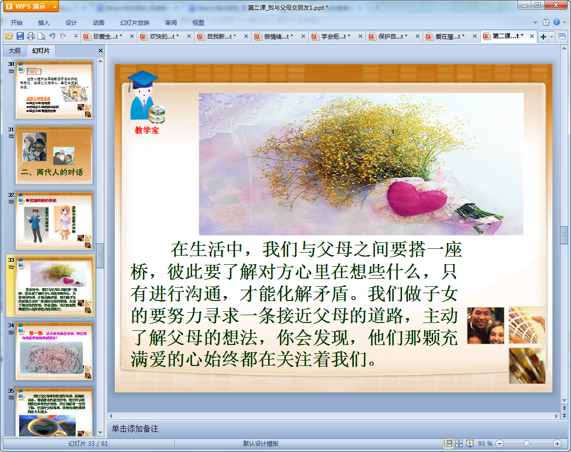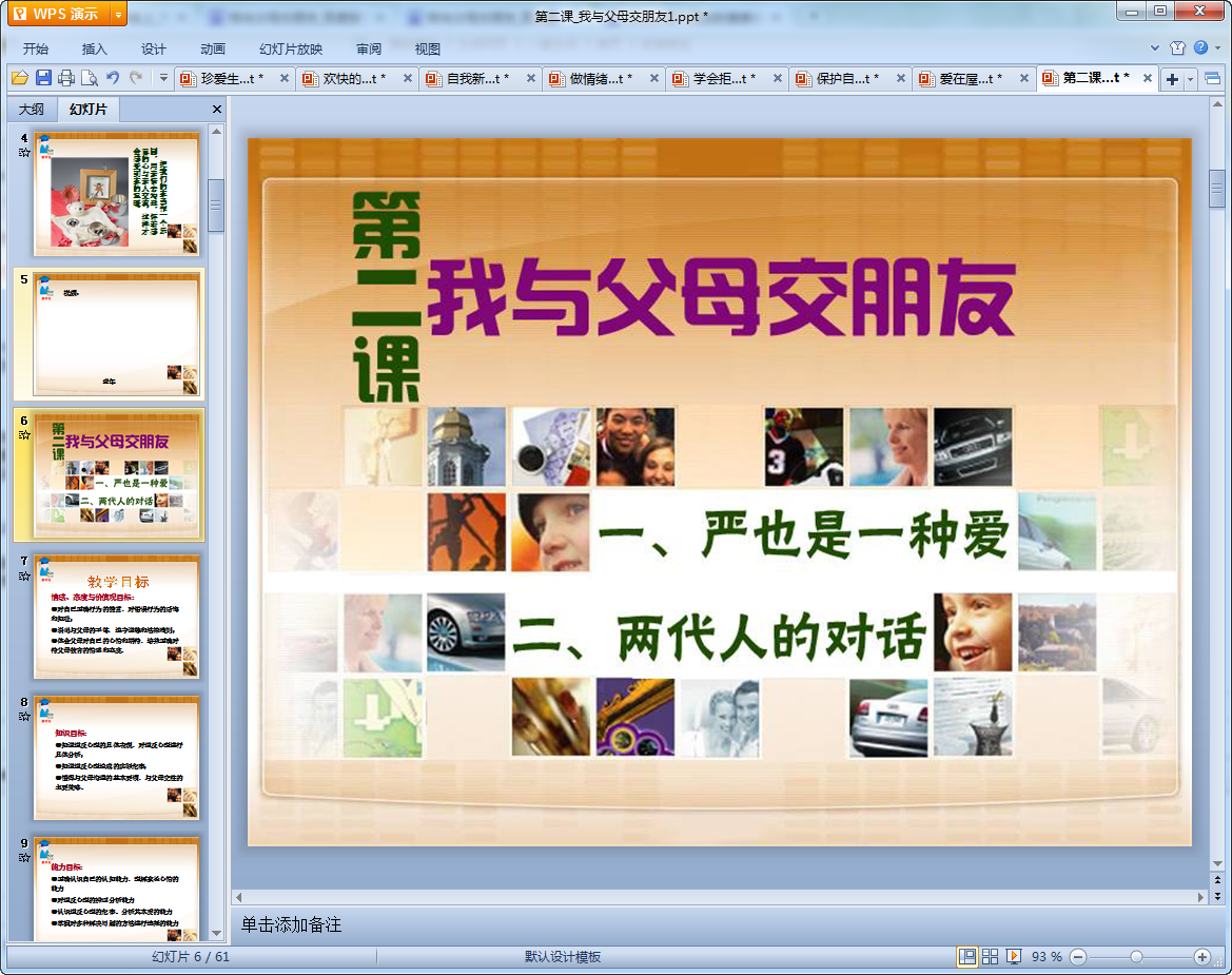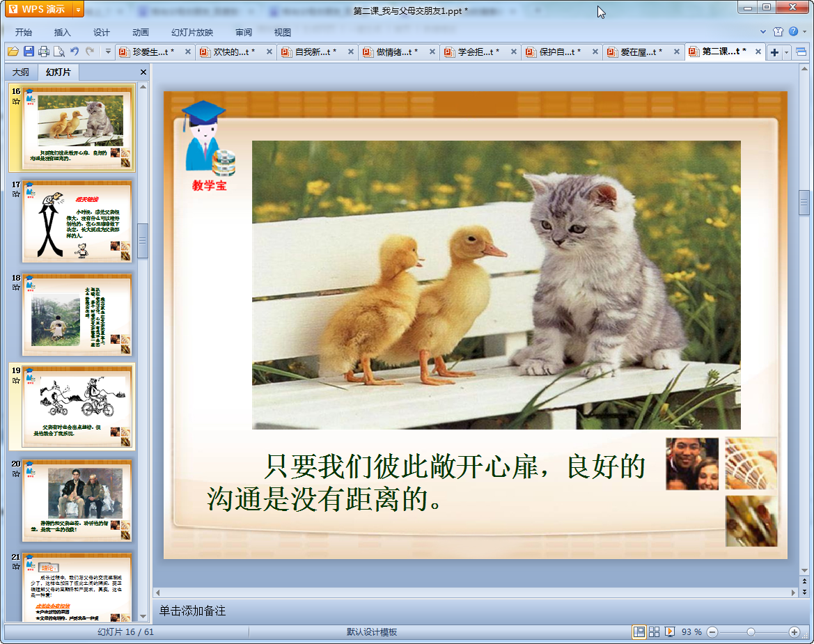 这是一篇初中政治教学课件我与父母交朋友ppt,该课件共有61页内容十分丰富,制作也十分精美深受学生们的喜爱,能提升学生们上课的热情,而且该课件教育意义对孩子们来说也是挺大的,有需要的朋友们可以来下载使用!