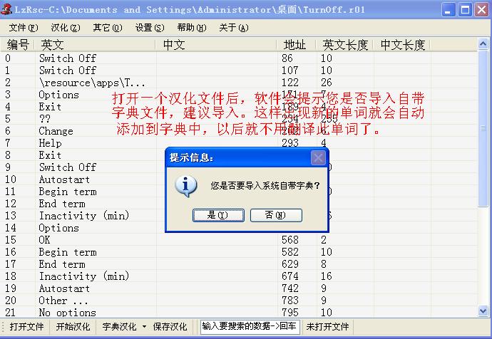 3:提示您是否导入字典,建议导入字典先汉化一下。如果字典中已经有的单词,您就可以不用再翻译了。导入字典汉化还有一个好处,就是只要有新的单词翻译出现,到软件最后退出时,就会询问您是否要把新的翻译添加到字典中。这样就是所谓的“日积月累”功能。