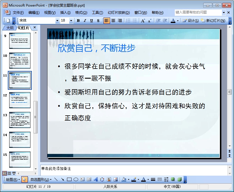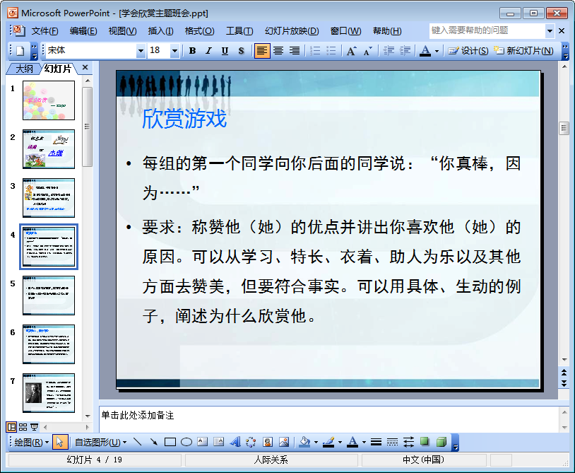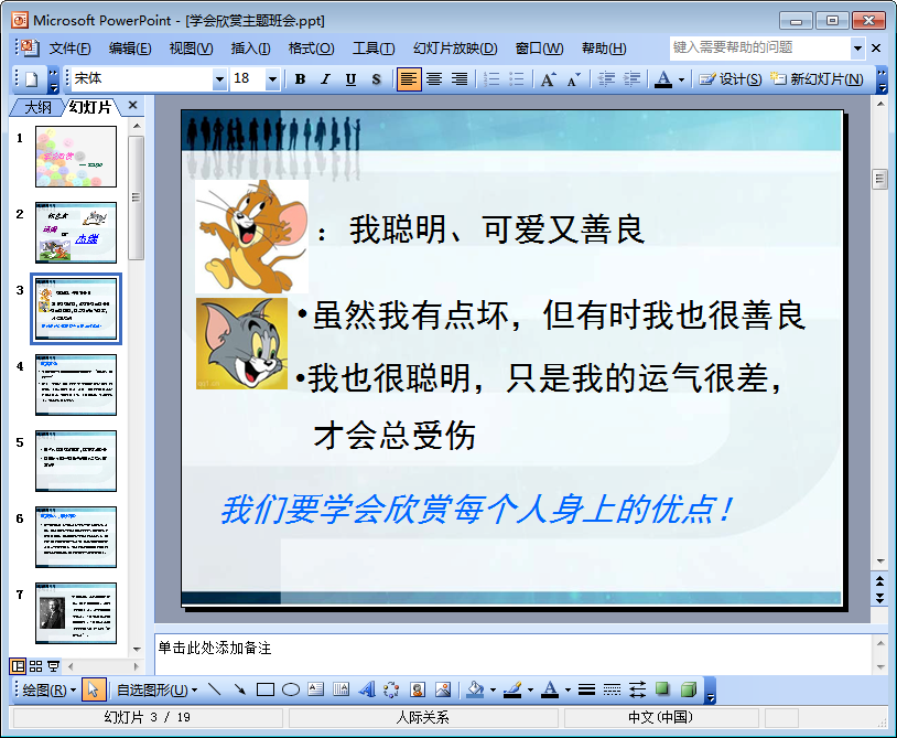 这份名为“学会欣赏主题班会课件”共由19页组成(下文称为学会欣赏主题班会ppt),该ppt内容包括与欣赏有关的故事,以及与欣赏有关的问题探讨——比如“同学们想一想怎样的同学是受人欣赏的?”等,该课件ppt在充满趣味性的同时又不失教育性,非常值得借鉴参考,欢迎有需要的朋友们前来下载!