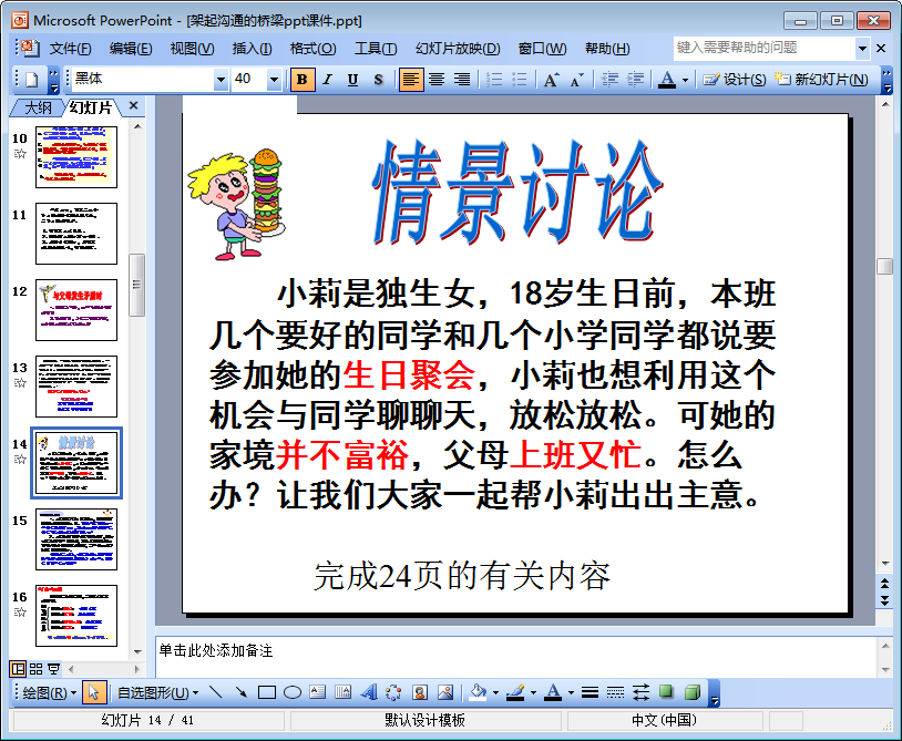 “架起沟通的桥梁”——与其说这是一份班会课件ppt,倒不如说这是一份家长会课件ppt——毕竟这是一次关于“两代人的对话”。小编为大家整理带来的这份架起沟通的桥梁ppt课件共由41页组成,内容完全免费,欢迎有需要的朋友前来下载!