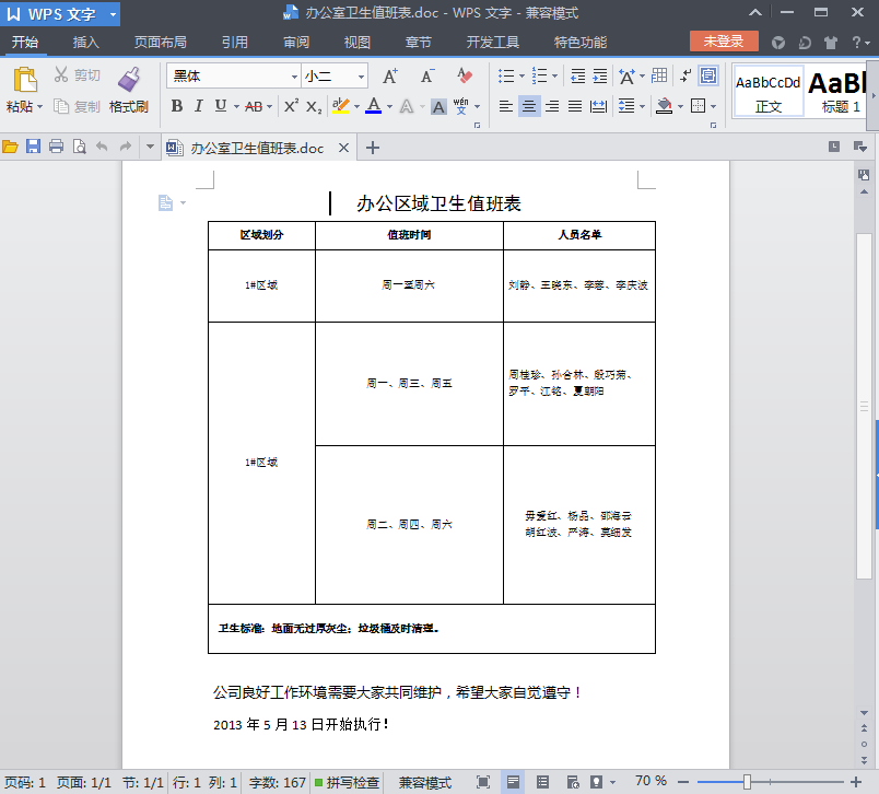 3、值日同事负责办公室当天的保洁工作,有事不能当值要提前调换。