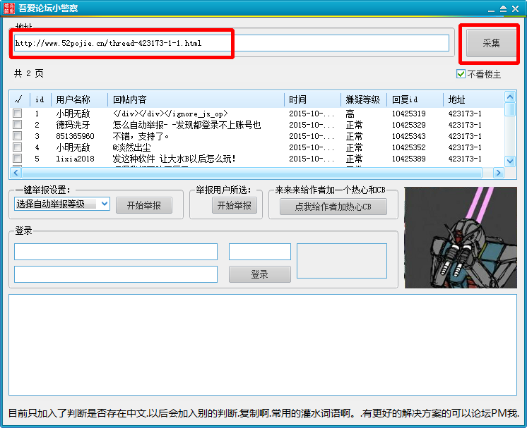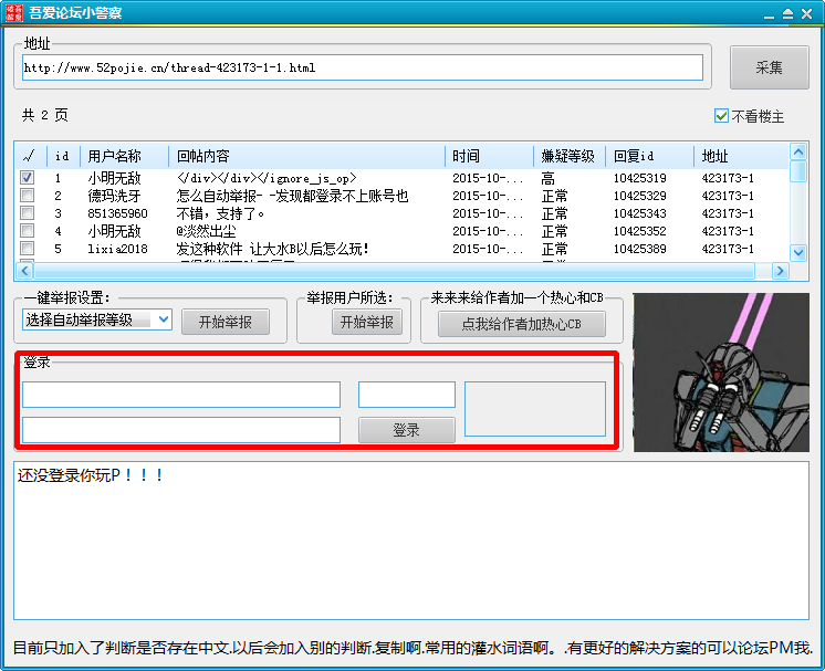 大致就是扫除一个帖子当中灌水的回复。然后一键举报。目前判断灌水还不行。只加入了不存在中文就是灌水。本来相加是否重复的,一看天亮了。还是先睡觉吧。软件只加了一个压缩壳子。
