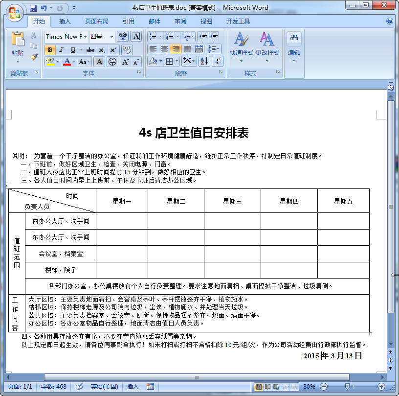 大家知道什么是4s店吗,其实也就是卖汽车的店子。非常的豪华大气哦。随着现在社会的不断发展,买车的人,不断地增多,4s店就要时刻保持整洁干净,仅仅有保洁人员的清扫是不够的,所以东坡小编带给大家的这份4s店卫生值班表就有用武之地了。