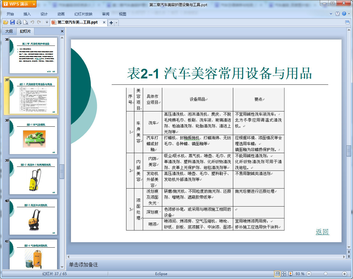 这是一篇关于汽车美容的汽车美容护理设备与工具教学课件,该课件内容丰富,对课本上的知识点描述的很详细有兴趣的玩家们可以来看看,我们冻坡为大家体统了免费的下载!