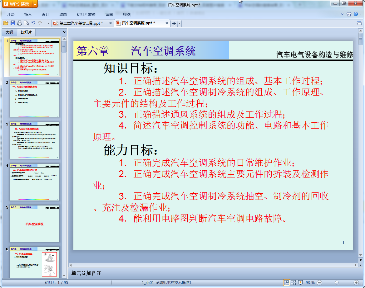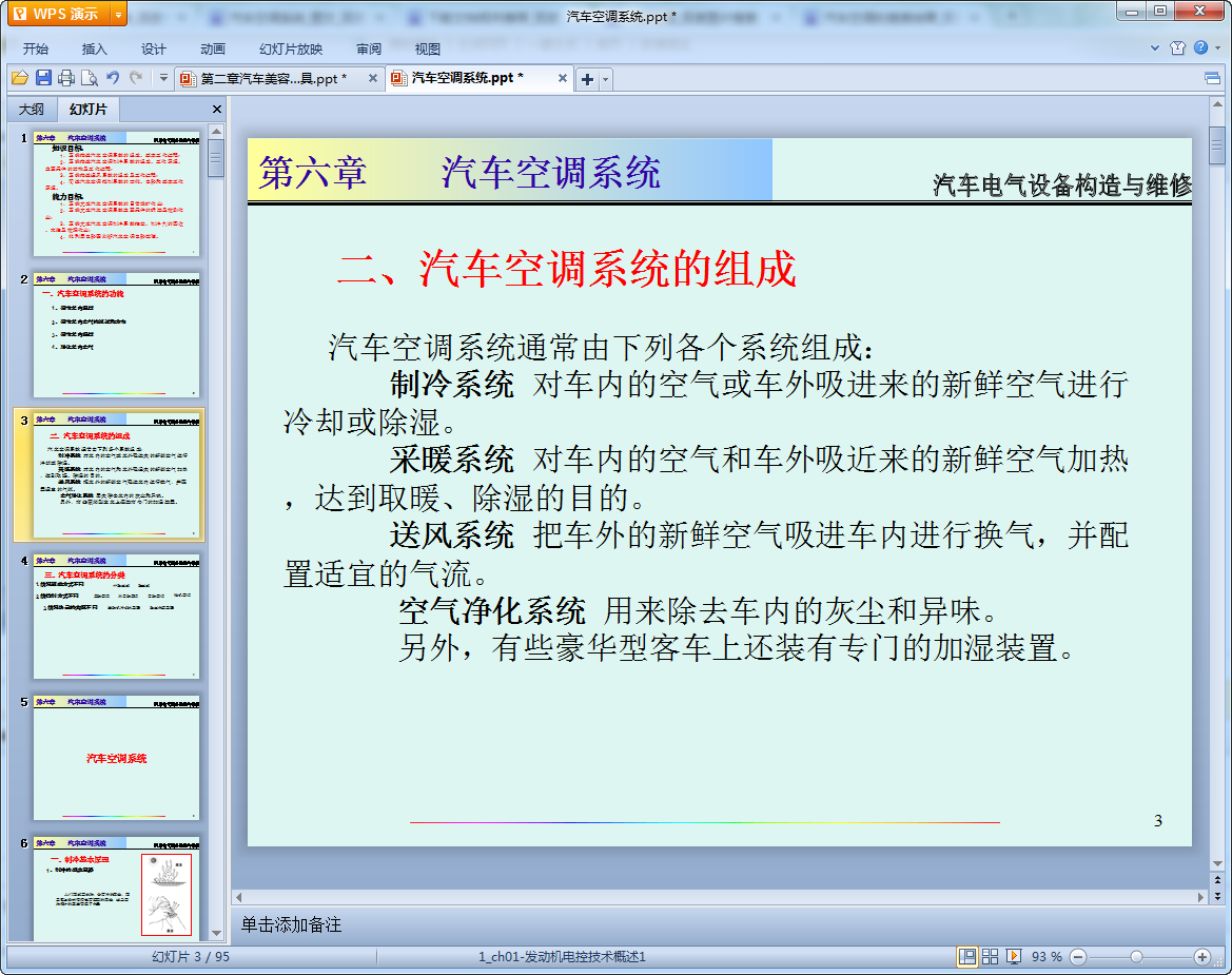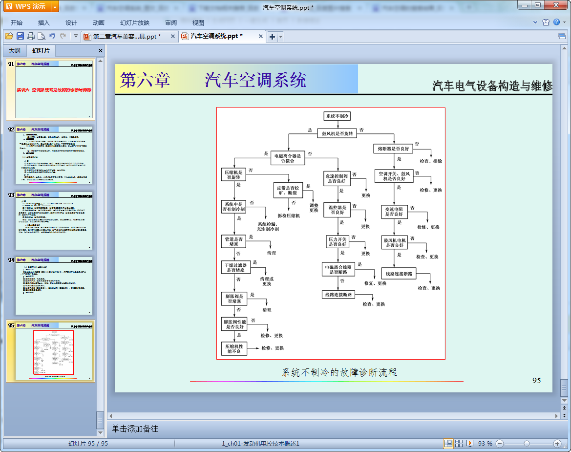 这是一篇汽车空调系统教学课件,该课件共有95页内容比较丰富,对课本上的知识点归纳的十分清楚,比较不错的教学课件,有需要的老师们或者想了解汽车空调部分的朋友们都可以来下载使用!