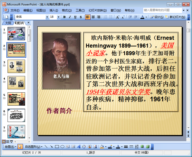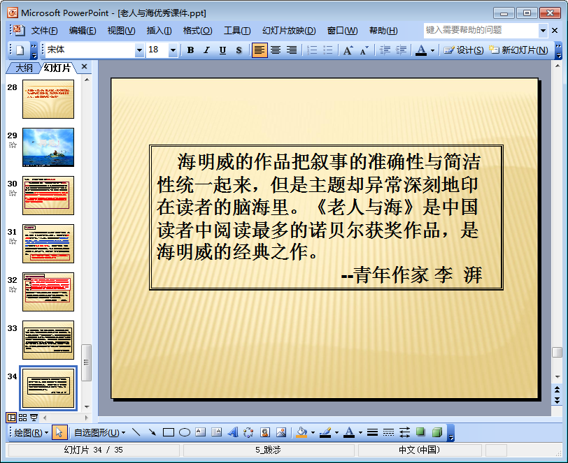 作者海明威是在什么样的背景下载创作出老人与海这本小说的呢?这本小说讲述的又是一个什么样的故事呢?小编为大家整理带来的这份由35页组成的海明威老人与海介绍ppt就详细全面的回答了这些问题,下文是该ppt的内容摘选及预览图,需要这份ppt完整内容的朋友只需轻轻点击本文相应的下载地址进行下载即可!