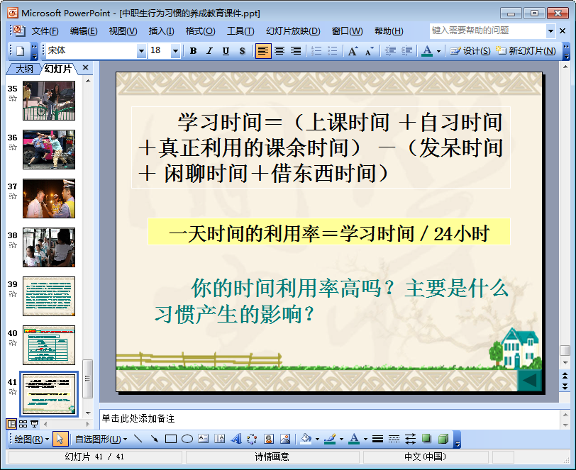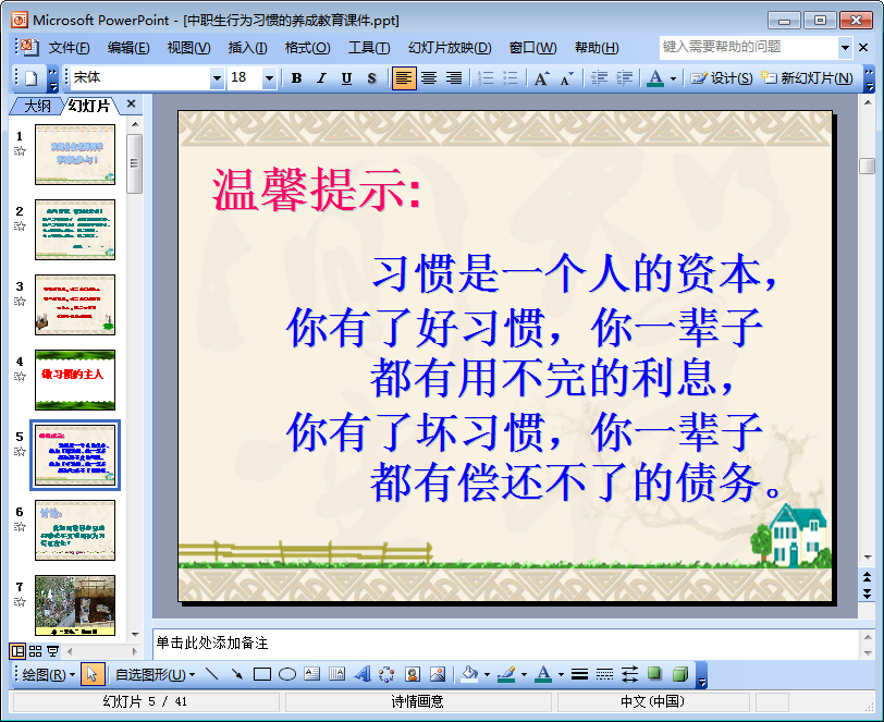 “播下一种习惯,收获一种性格”——这是一份行为习惯主题班会ppt,更具体一点介绍的话,这是一份中职生行为习惯的养成教育课件ppt,该ppt共由15页组成,ppt内容结合学生身边的实例进行分析说明,十分具有教育意义,下文是该ppt的内容摘选及预览图,希望对大家有所帮助!