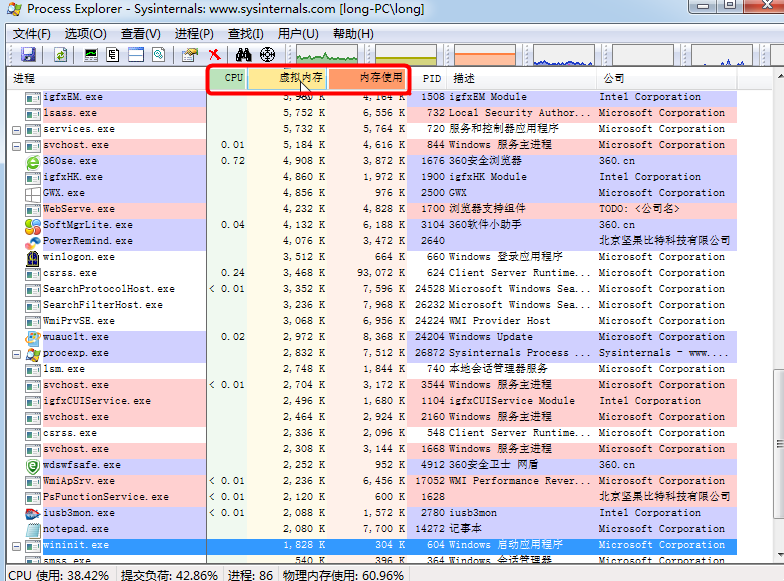 打开 ProcessExplorer 软件之后,点击“cpu”“虚拟内存”“内存使用率”来查看进程情况