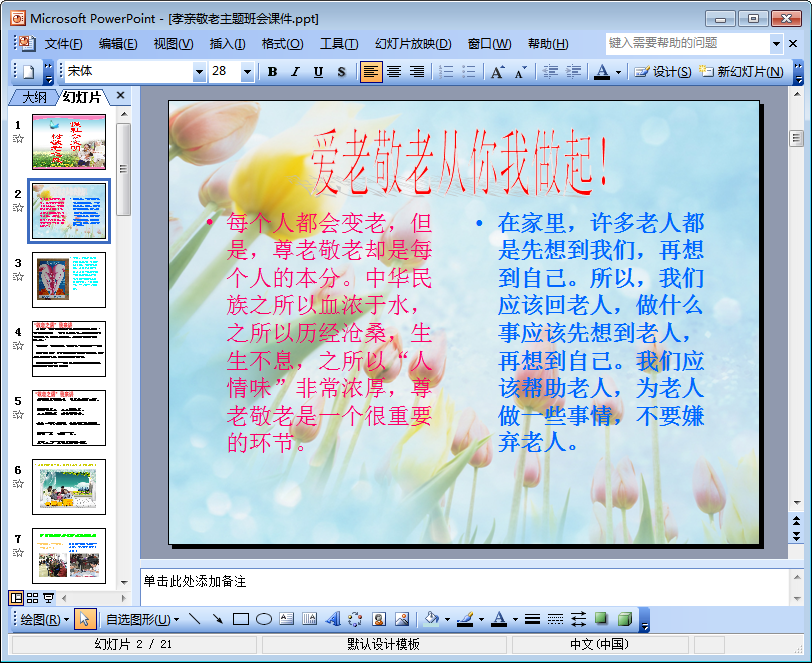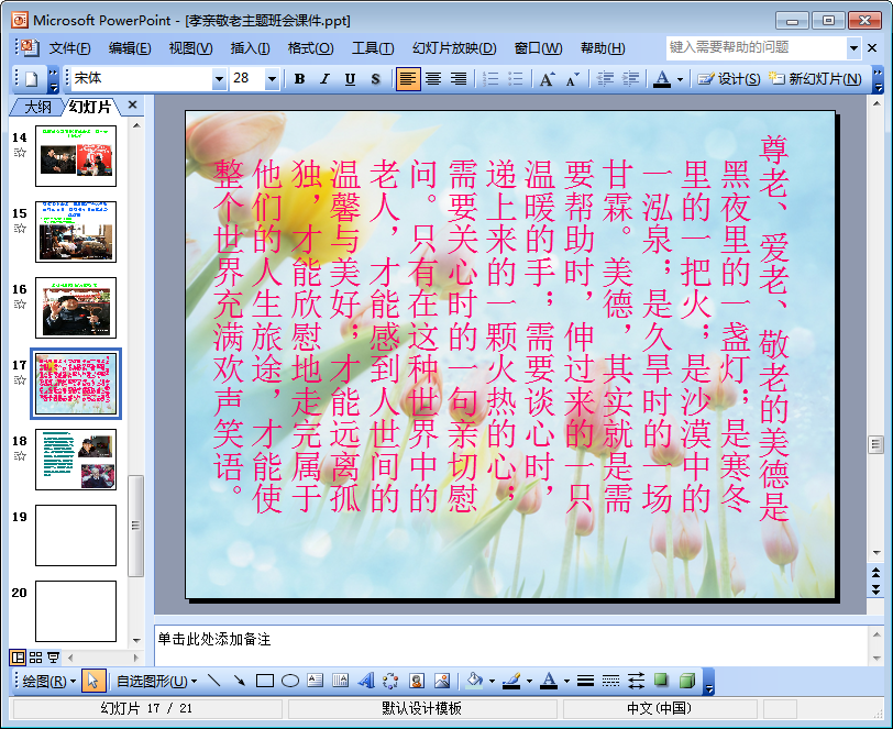 这份以ppt形式展现的重阳节孝亲敬老主题班会课件共由21页组成,ppt图文并茂,内容十分完整全面,需要重阳节班会ppt或是孝亲敬老主题班会ppt的朋友东坡小编建议你可以将这份ppt下载下来参考一下,相信你不会对其中的内容失望的哦!