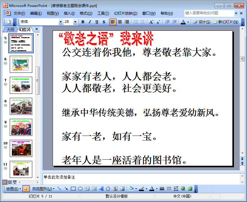 尊老、爱老、敬老的美德是黑夜里的一盏灯;是寒冬里的一把火;是沙漠中的一泓泉;是久旱时的一场甘霖。美德,其实就是需要帮助时,伸过来的一只温暖的手;需要谈心时,递上来的一颗火热的心;需要关心时的一句亲切慰问。只有在这种世界中的老人,才能感到人世间的温馨与美好;才能远离孤独,才能欣慰地走完属于他们的人生旅途,才能使整个世界充满欢声笑语。