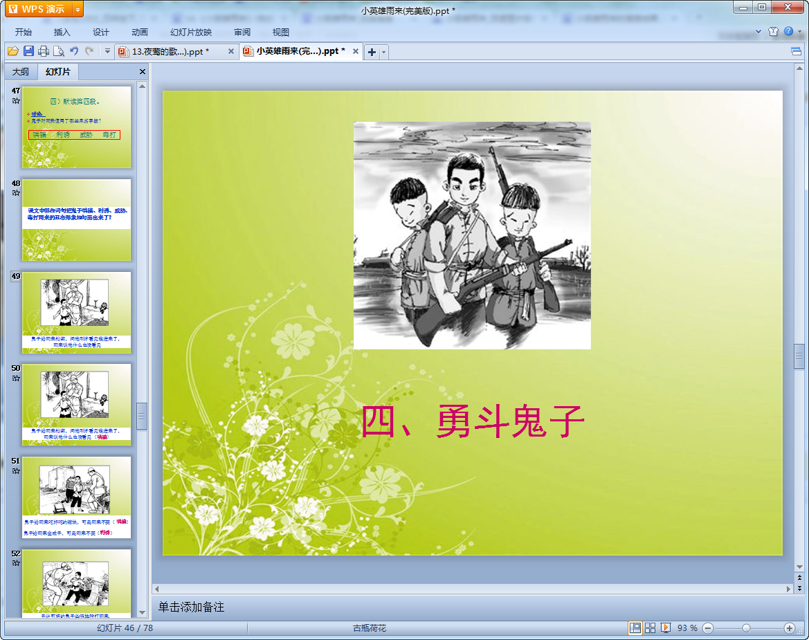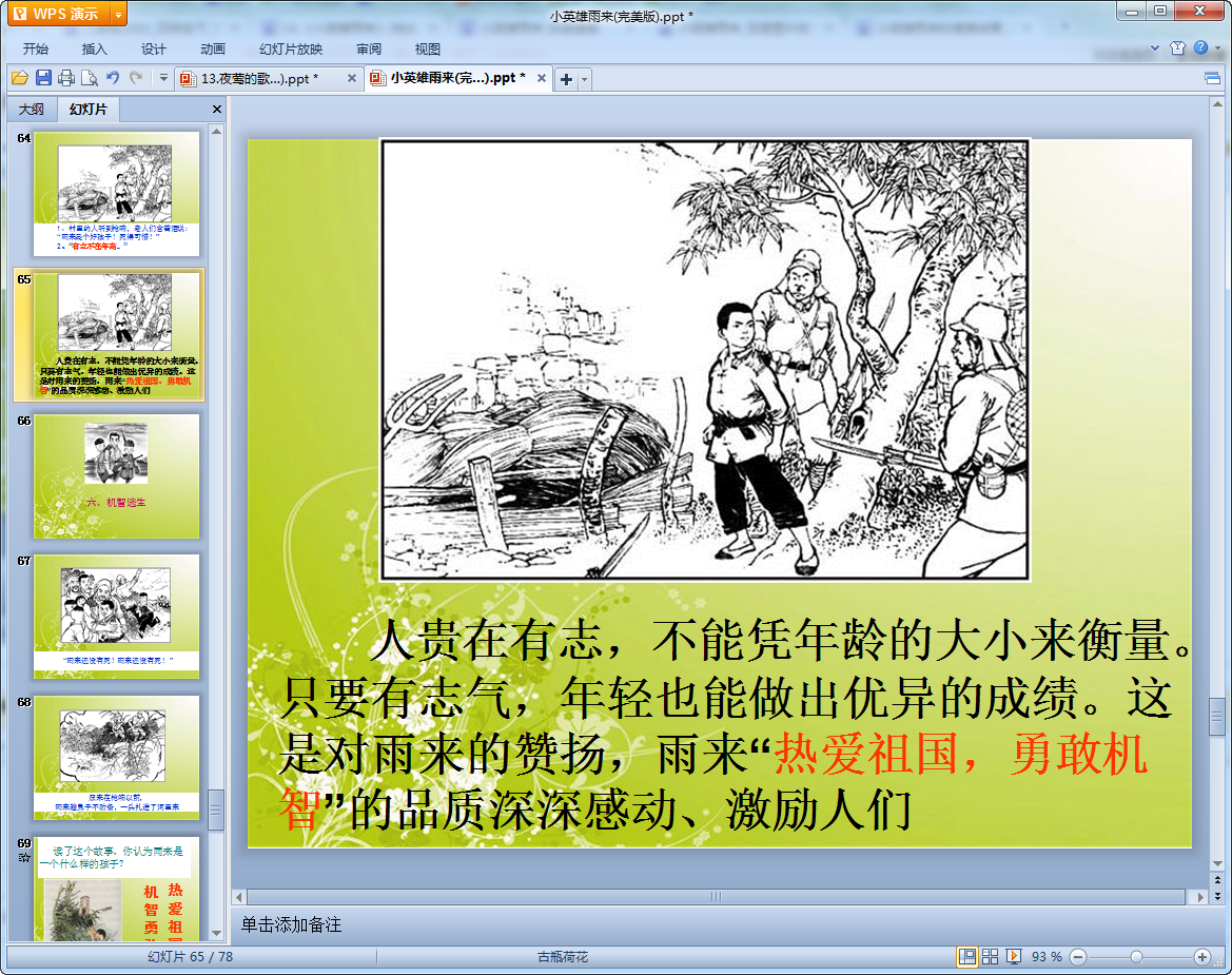 这是一篇小学语文课文小英雄雨来教学课件ppt,该文中讲述了我们的小英雄雨来勇敢机智的的对面日本侵略者的利诱逼供不妥协的故事,该课件共有78页内容十分丰富对课文的讲解也十分详细,十分不错的一份教学课件,有需要的可以来我们东坡下载使用!