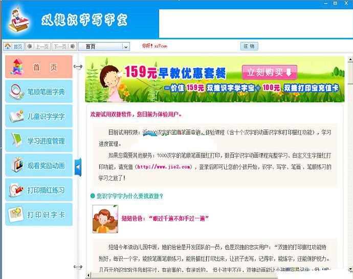 双捷识字写字宝是一款绿色好用的儿童综合识字软件,填补了该类儿童识字软件仅能在电视或者电脑上演示的空白,软件功能丰富,可以支持从儿童识字到写字练字的全阶段。课程设有动画学习、笔顺笔画学习、在线描红练习、打印出描红册实体练习、识字卡5大部分,家长或者老师可以根据孩子的具体情况进行安排。