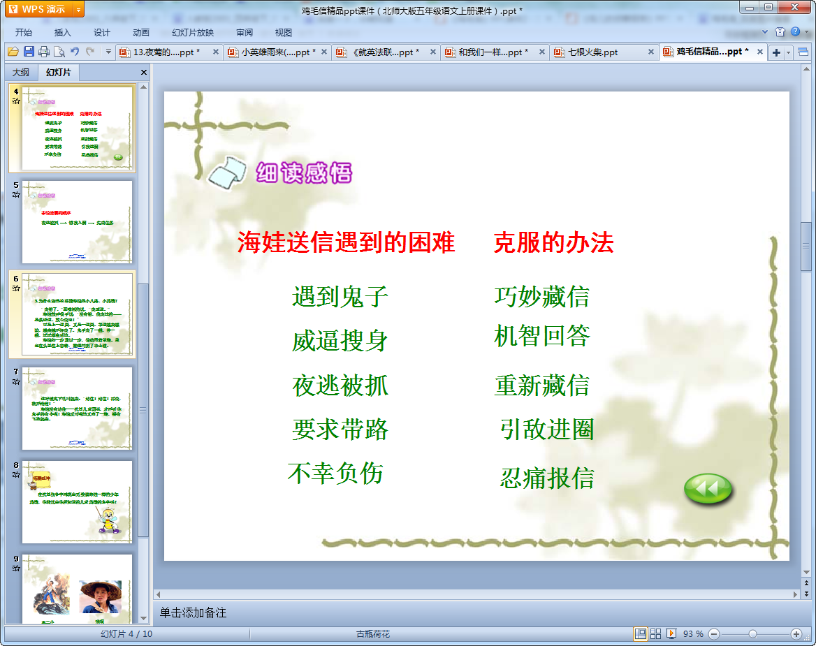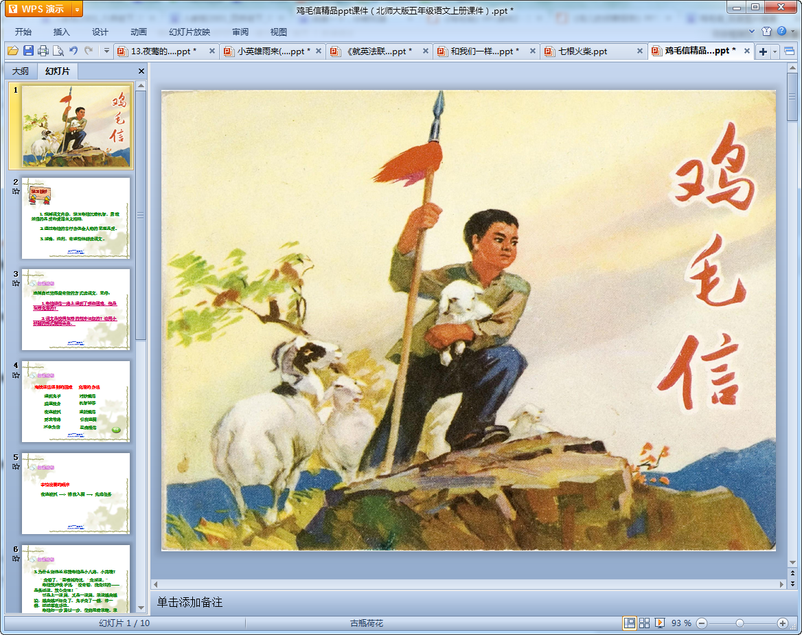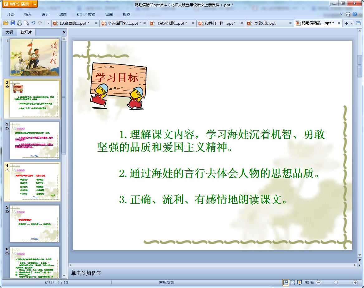 这是一篇语文课文鸡毛信教学课件。该课件共有11页制作精细内容简洁对课本讲解的十分清楚,讲述了海娃沉着机智、勇敢坚强的品质和爱国主义精神,有需要的朋友们可以来看看,我们为大家提供了免费的下载!