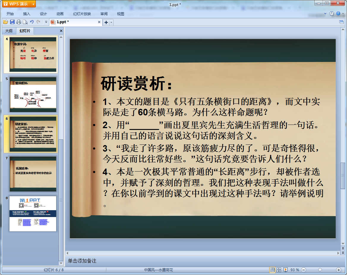 这是一篇富有哲理的课文只有五条横街口的距离教学课件,该课件共有8页内容比较简洁,制作十分精细,对课文的嘘唏目标都做出了指示,有需要的老师们可以来看看,我们为大家提供了免费的下载!