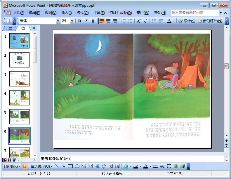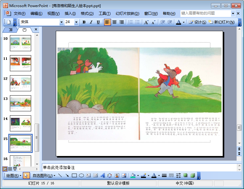 路上碰到小鸭和青蛙弗洛格,小猪兴奋地问:“你们看到那个陌生人了吗?”“还没呢!他长什么模样?”小鸭问。“我看呀,他是一只又丑又脏又狡猾的老鼠!”小猪很权威地说。“他到这儿来干什么?”“对老鼠可要小心,他们专会偷东西!”小鸭也显得很有见识。“你怎么知道?”弗洛格问。“人人都知道这一点。”小鸭生气地说。