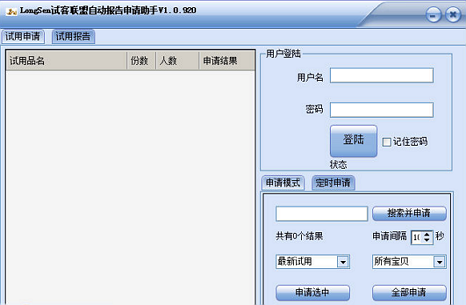LongSen试客联盟自动报告申请大师适用于试客联盟的产品申请,报告填写。专为高效人士定制,节省你的宝贵时间,让你无需再在试用品申请和报告撰写上浪费时间,有需要的赶紧来下载使用吧。