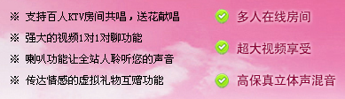 全新的娱乐界面、超清晰的视讯接入、立体声宽频语音的传送、享受数千人KTV房间共同K歌的感觉,让您一展歌喉,震撼发声.