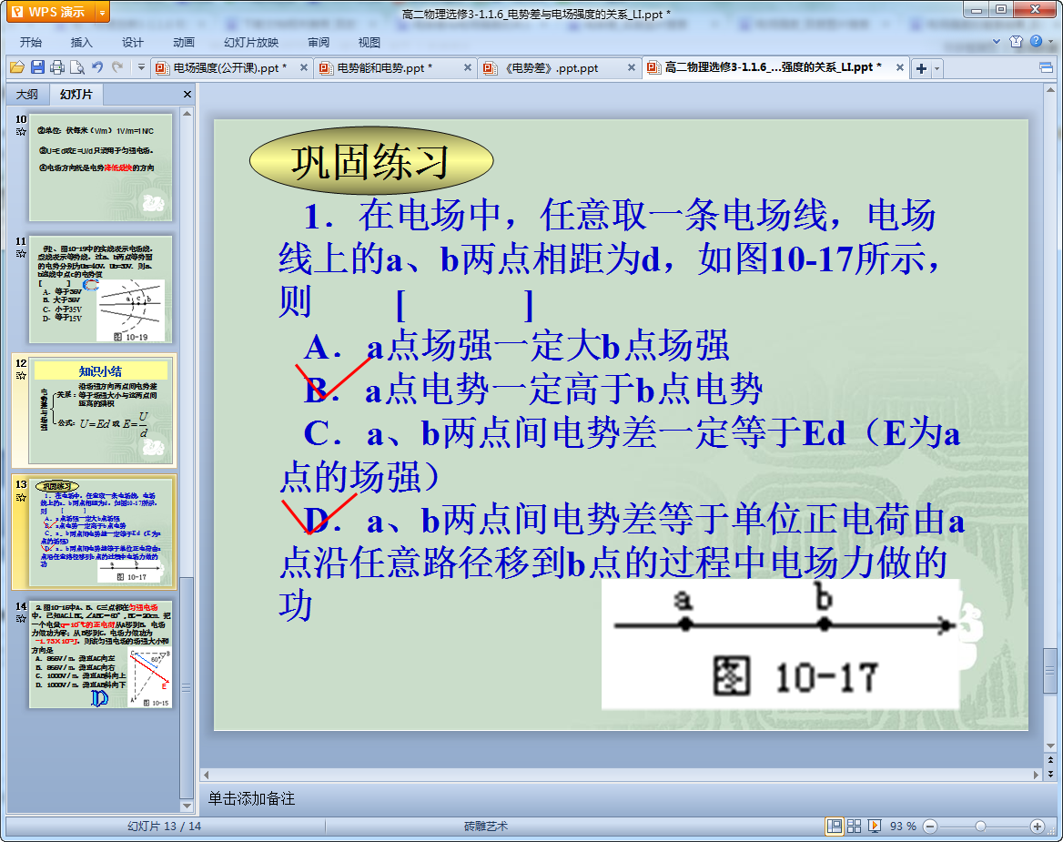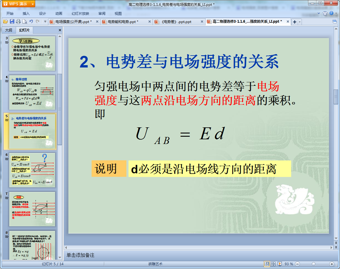 沿场强方向两点间电势差 等于场强大小与这两点间距离的乘积