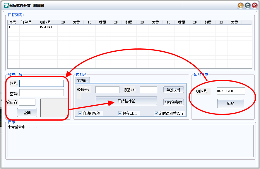 使用本软件,需要先添加订单账号,也就是待刷圈圈赞的账号,然后登陆小号,最后点击【开始拉标签】