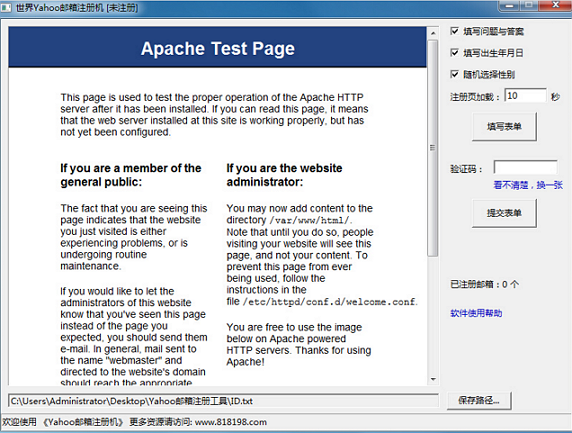 (可注册到:@yahoo.com,@yahoo.com.hk,@yahoo.com.tw,@yahoo.co.uk,@yahoo.in ……)虽然是世界各地的yahoo邮箱,但是它们有个共同点,SMTP地址都是:smtp.mail.yahoo.com 端口:25程序特性:自动生成并输入用户名,随机生成密码,并自动输入其他注册必填项(可选功能)人工输入验证码....半自动批量注册yahoo邮箱。注册成功或失败都有提示,假如注册成功,软件会将邮箱帐号和密码自动保存到指定文件里(软件默认保存到 ID.txt)。保存格式为:邮箱名,密码一行一个邮箱帐号。