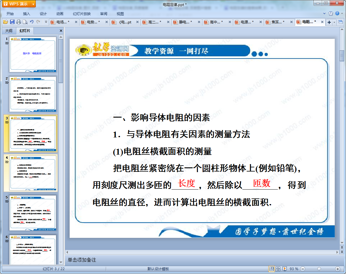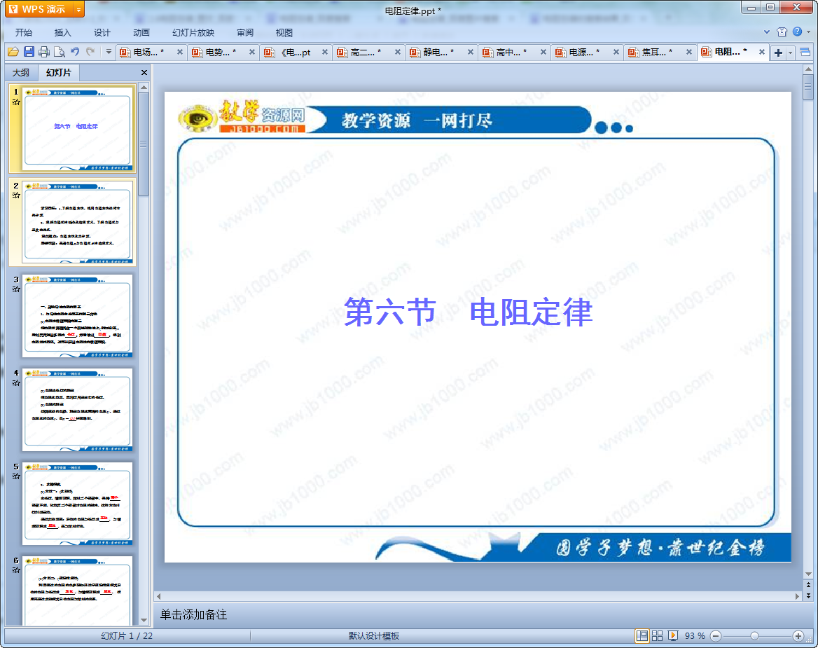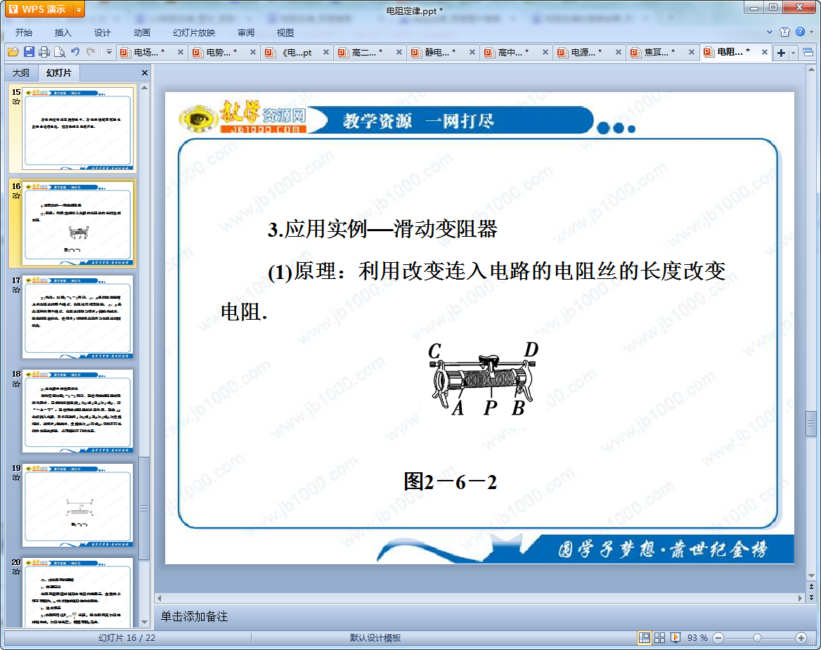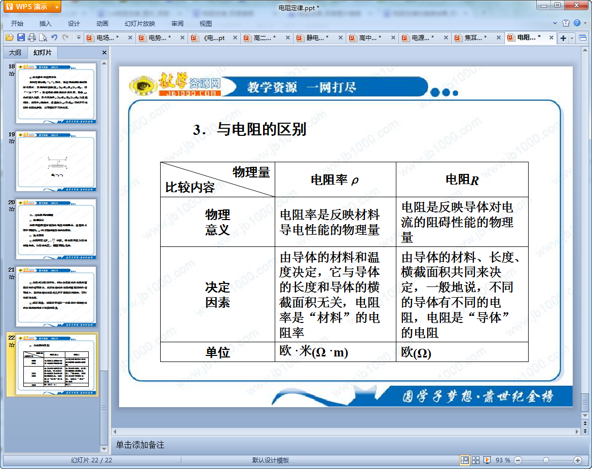 这是一篇高中物理电阻定律教学课件,该课件共有22页制作精美内容丰富,对课本上的知识点归纳的十分清楚,十分不错的教学课件有需要的朋友们可以来看看,我们东坡为大家提供免费的下载!