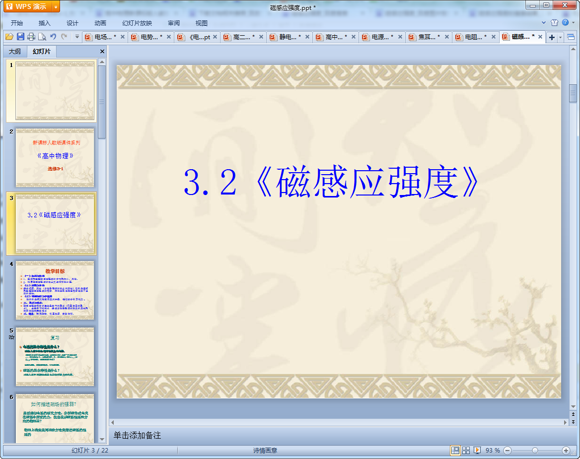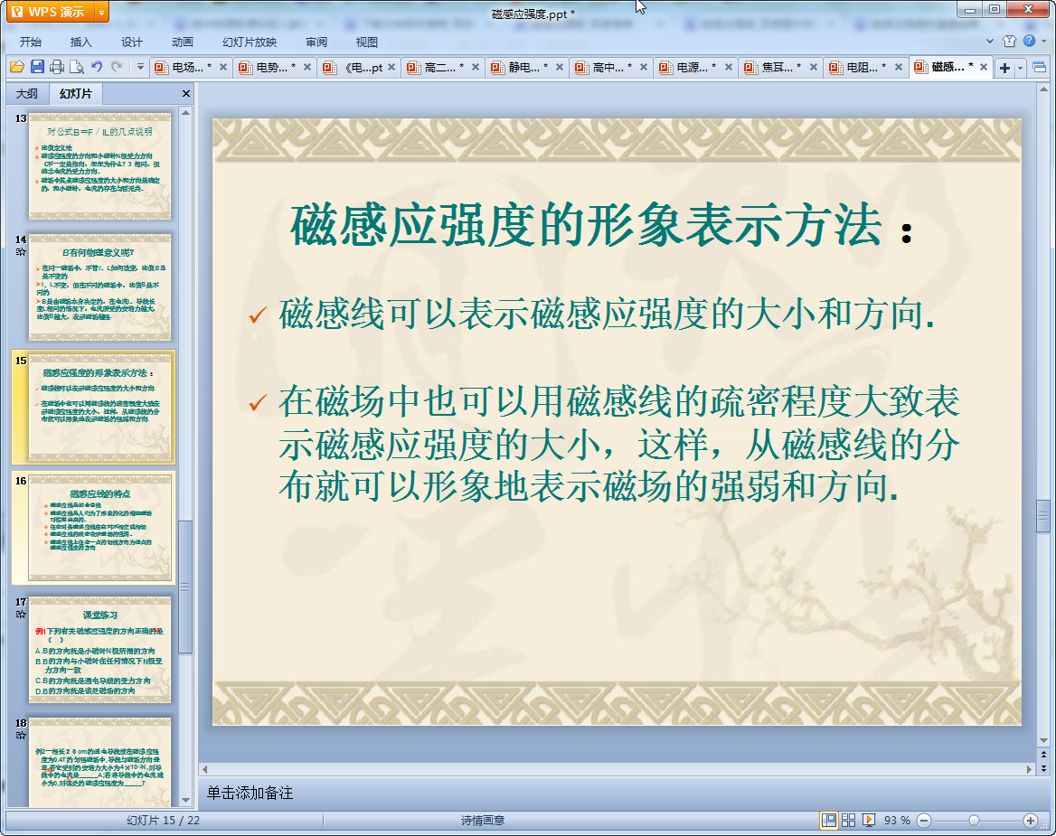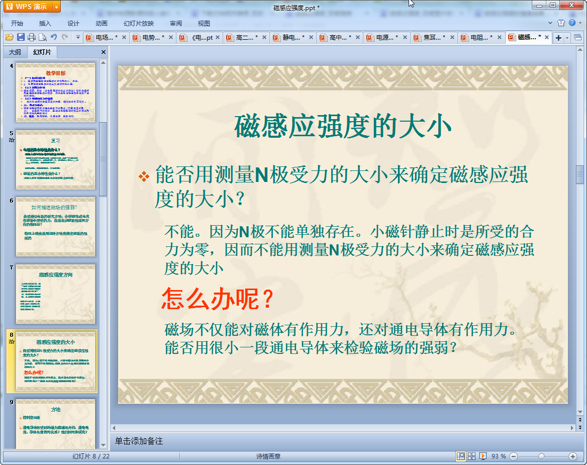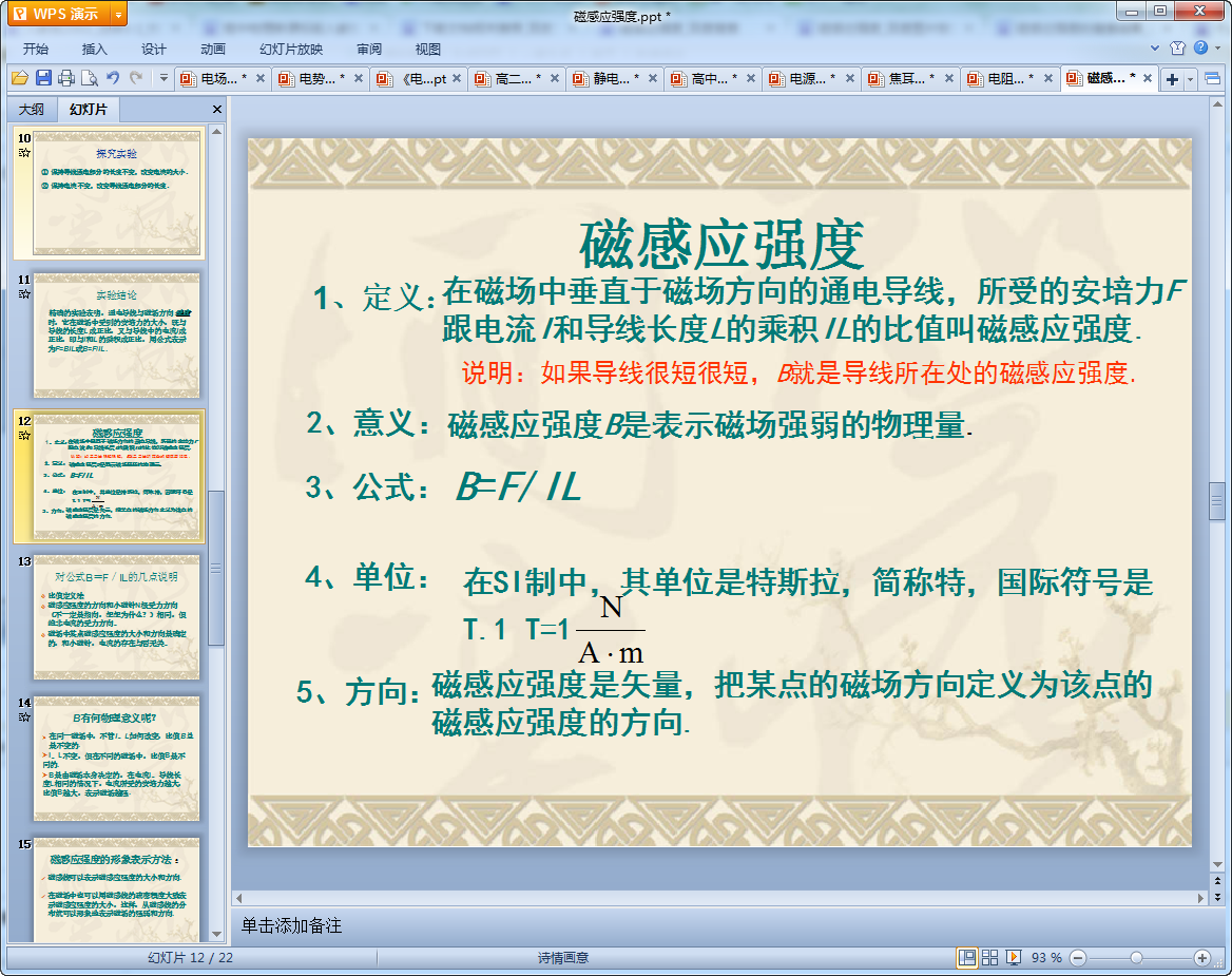 这是一篇高中物理教学课件磁感应强度ppt,该课件共有22页,内容丰富对知识点的归纳比较详细,需要制作磁感应强度ppt的老师们可以将这个加以修改就能使用,快来下载使用吧!