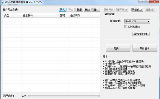 Web邮箱自动登录器,自动清理无效邮件帐户当前版本支持邮箱列表,hotmail.com,hotmail.it,live.cn,163.com,yahoo.cn, yahoo.com,yahoo.it, yahoo.com.hk,libero.it, virgilio.it,alice.it,aol.com,tiscali.it软件特征 绿色软件、无需安装,软件大小不超过80K通过http协议登录,非IE模拟操作,效率高,占有资源少后台多线程支持,速度更快。