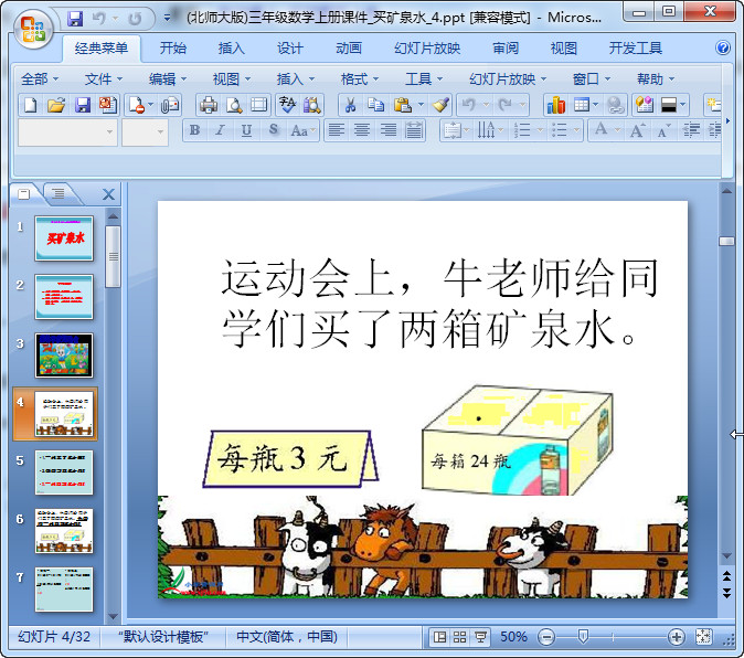 在学校的时候,有时候运动的时候,从体育场下来,会帮大家买水,那么大家肯定要计算一下,总共有多少钱。这份买矿泉水免费课件,教会你如何计算,欢迎前来东坡下载使用。
