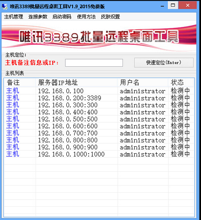 唯讯3389批量远程桌面工具是服务器管理员IT网管首选必备工具,完美方便的管理VPS和服务器,保证资料安全,方便快捷,操作简单,有需要的赶紧来下载使用吧。