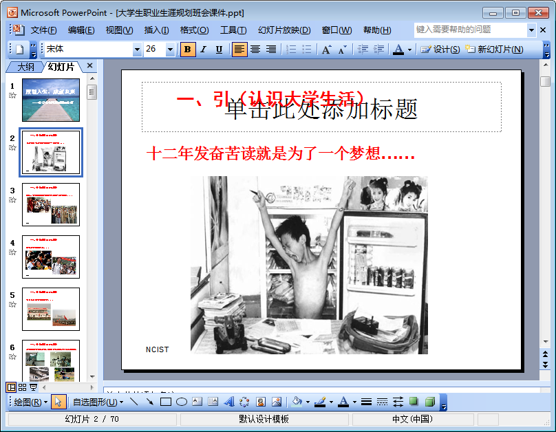 “规划人生,成就未来”,该大学生主题班会ppt之大学生职业生涯规划班会课件共有70页,ppt对大学生如何规划职业生涯这一问题做了详细的介绍,另外,该ppt内容还包括与职业生涯有关的自我评估、环境评估、职业定位、计划执行、反馈修正等,欢迎有需要的朋友前来下载查阅!