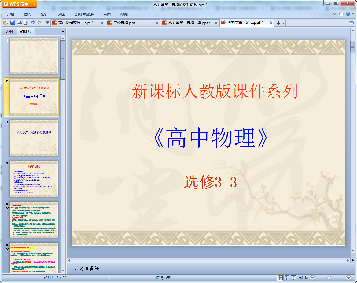 这是一篇高中物理中的热力学第二定律的微观解释教学课件ppt,该课件共有25页内容制作精细,对课本上的内容归纳的也十分完整,深受老师们的喜欢,有需要的朋友们可以来下载使用,不会让你们失望!