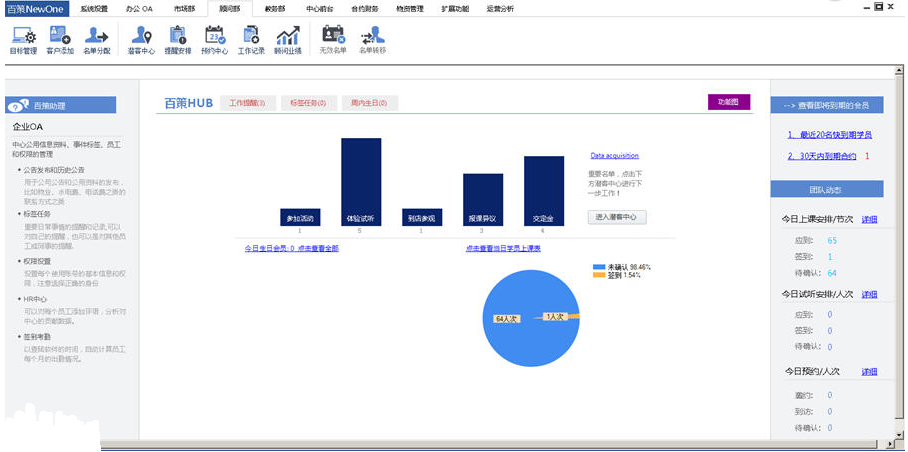 百策早教招生管理软件,是一套功能强大的营销管理软件。在功能上早教中心日常工作中所有的工作都可以通过软件实现,包括各个报表的生成。在操作上实现流程化的办公,让每个员工都能轻松便捷的完成工作。同时借助移动手机端,真正帮助早教中心控制成本,提高效率。